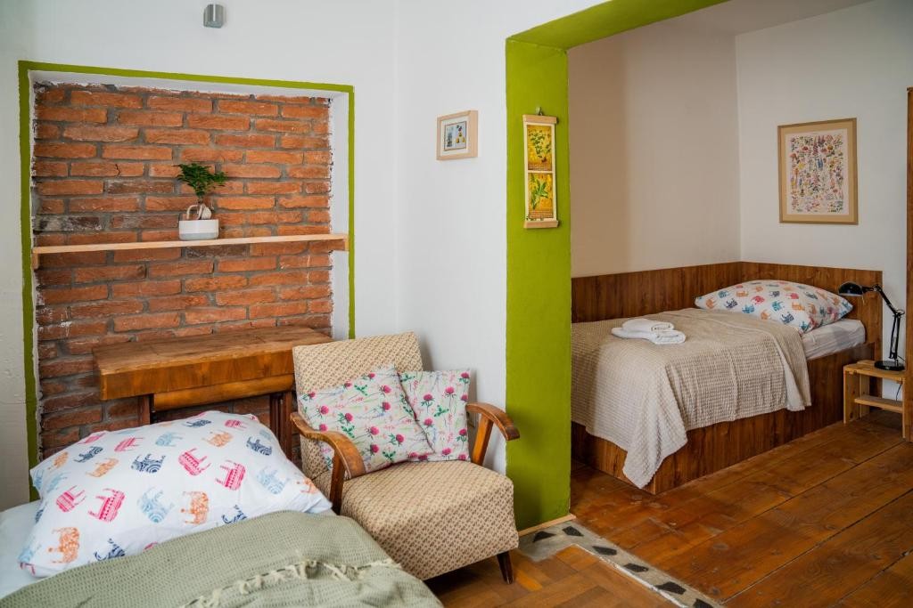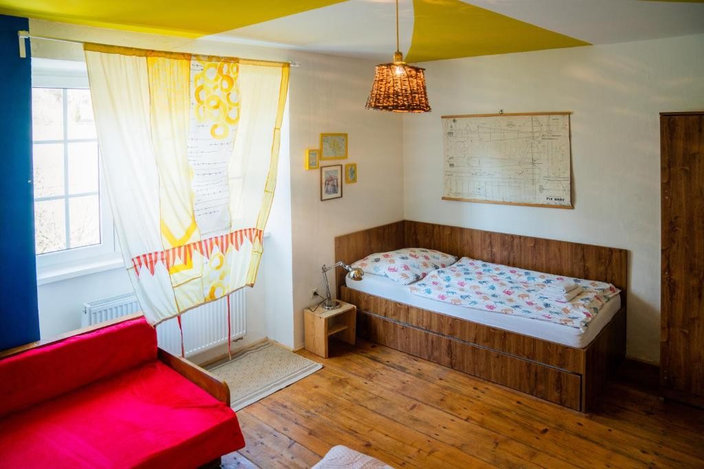- Spoločenská miestnosť: Vybavená na školenia a workshopy (projektor, reproduktor, flipchart, matrace a vankúše na sedenie, skladacie stoly a stoličky).